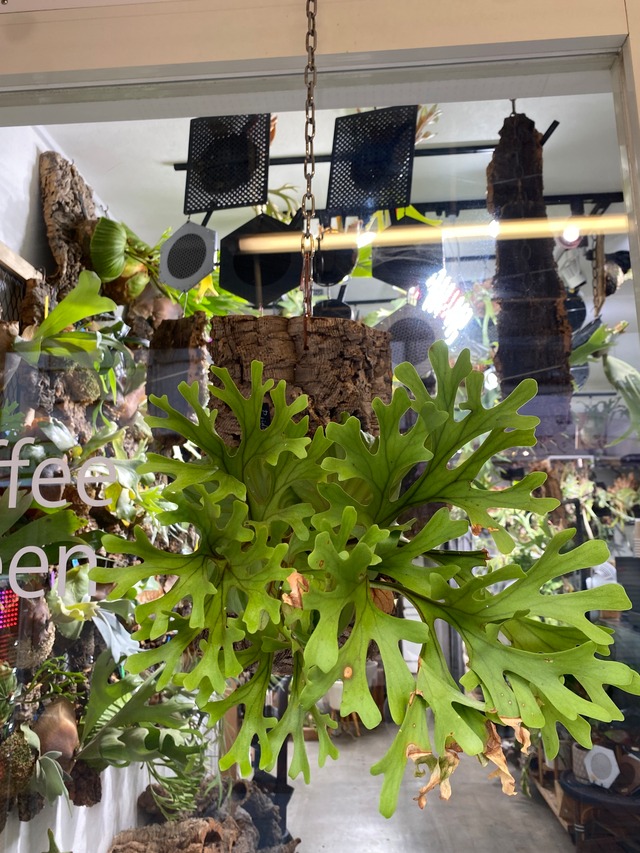 ビカクシダ ウィリンキー朱雀 伝説の鳥〝朱雀〟の名を冠した、 気品と力強さを持ち合わせた美しい品種。 華やかに伸びる胞子葉は空間に映え、 目を引く独特な存在感があります。